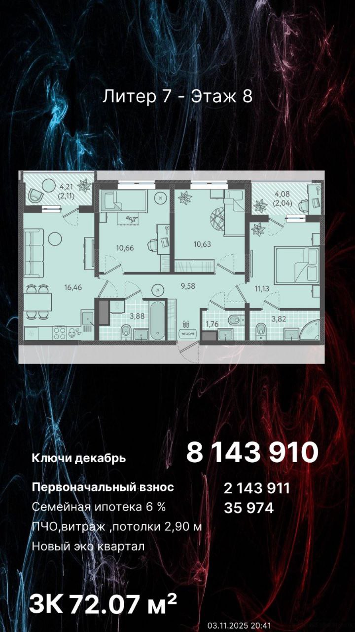 3-комнатная 72,07 м² — от 8 143 000 ₽.