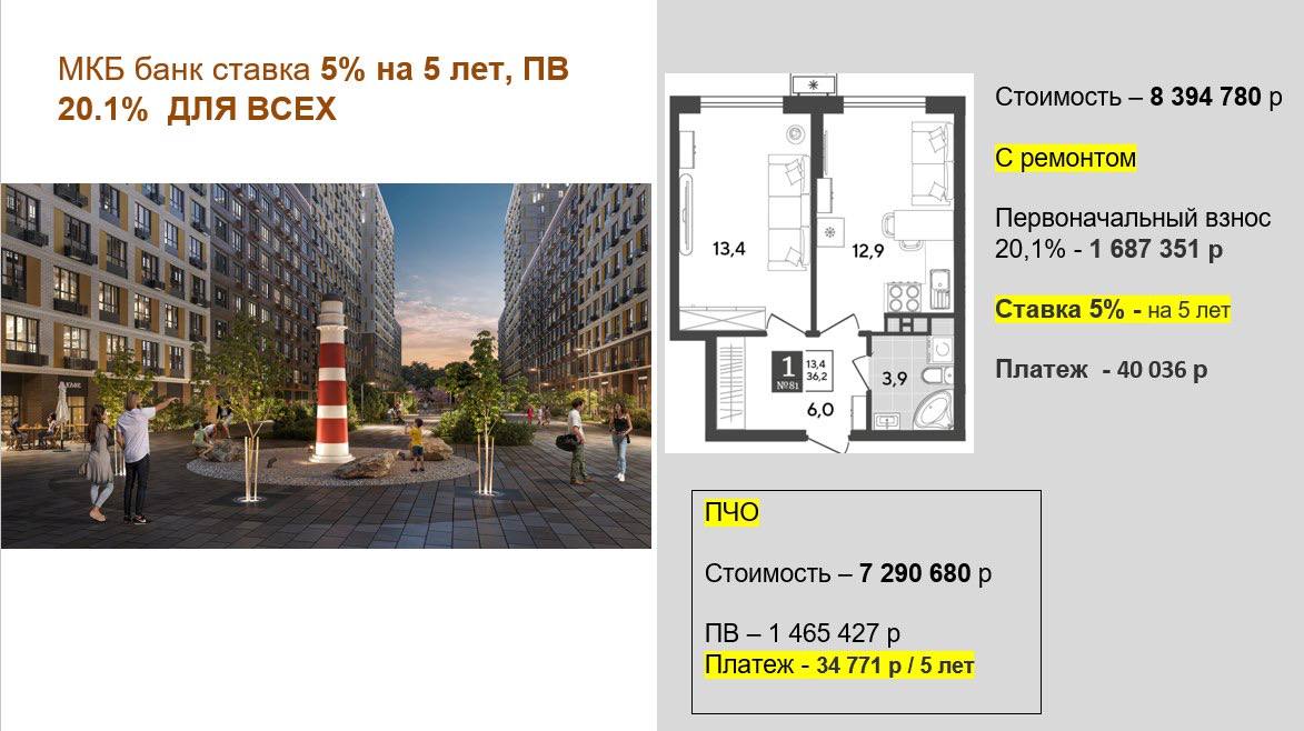 Для покупателей квартир действует специальная программа ипотечного кредитования с фиксированной ставкой 5% годовых на весь срок займа. Предложение разработано в партнёрстве с МКБ Банком и распространяется на приобретение жилья при первоначальном взносе от 20,1%.