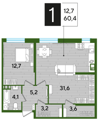 1 | 60.4 / 12.7 м² | от 9 144 560 руб. (151 400 руб./м²) | Планировка | |