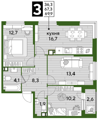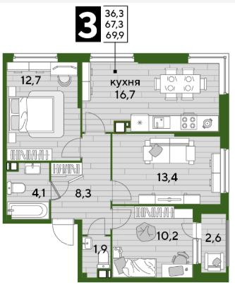 3 | 69.9 / 36.3 м² | от 9 918 810 руб. (141 900 руб./м²) | Планировка |