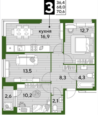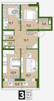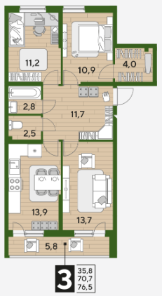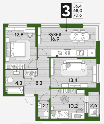 3 | 70.6 / 36.4 м² | от 9 672 200 руб. (137 000 руб./м²) | Планировка |