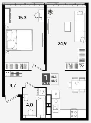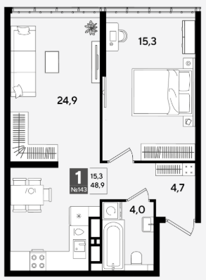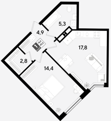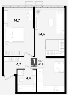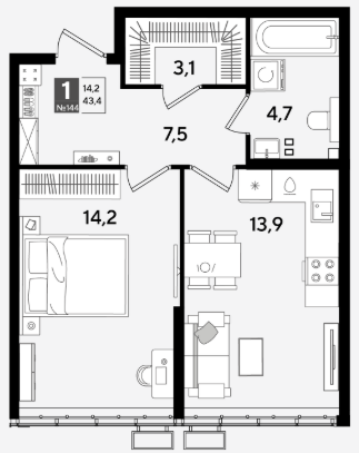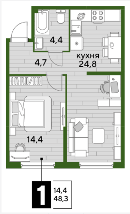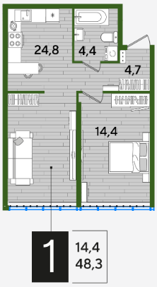 1 | 48.3 / 14.4 м² | от 7 839 090 руб. (162 300 руб./м²) | Планировка |