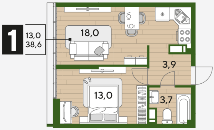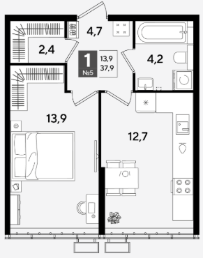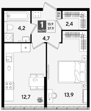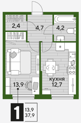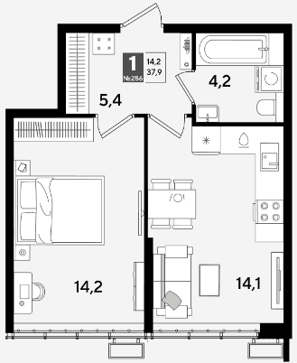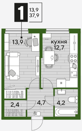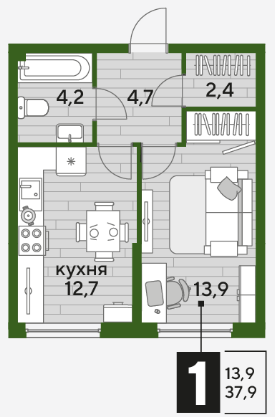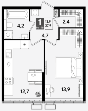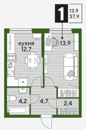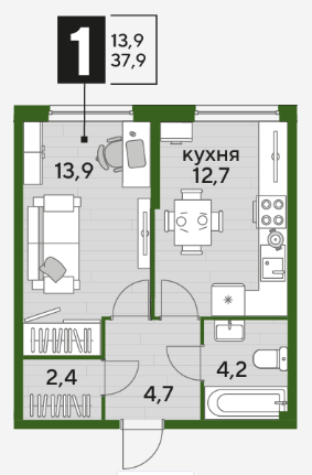 1 | 37.9 / 13.9 м² | от 7 132 780 руб. (188 200 руб./м²) | Планировка | |