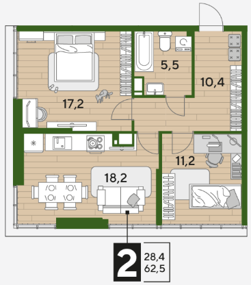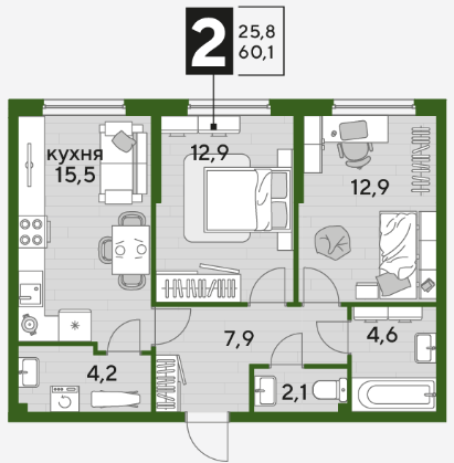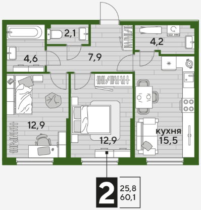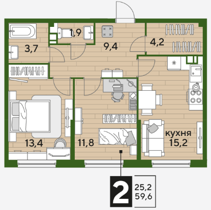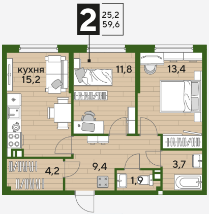 2 | 59.4 / 25.2 м² | от 9 201 060 руб. (154 900 руб./м²) | Планировка | |