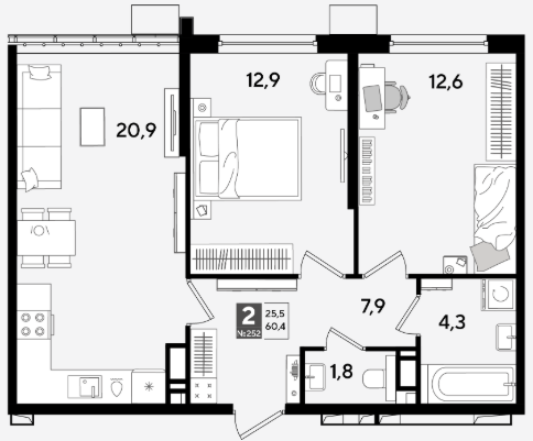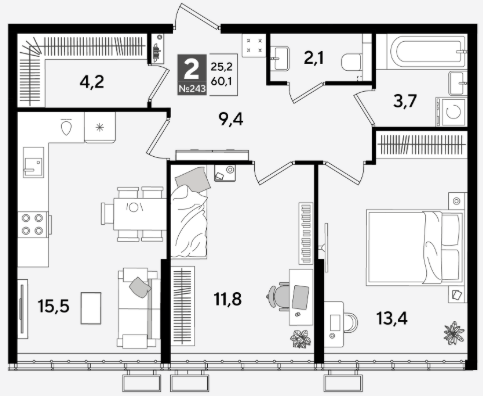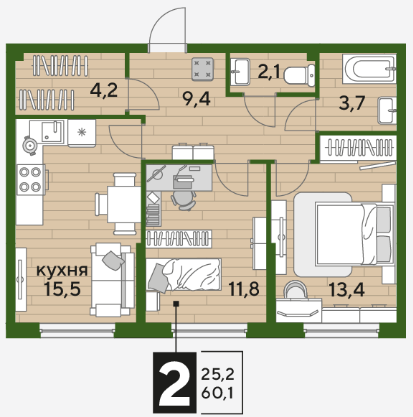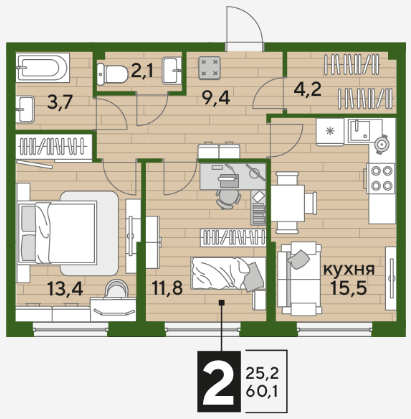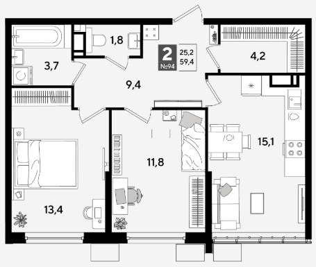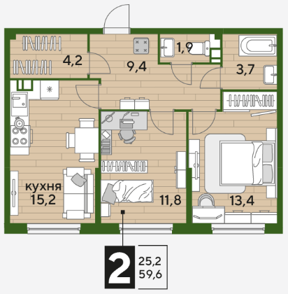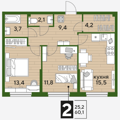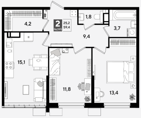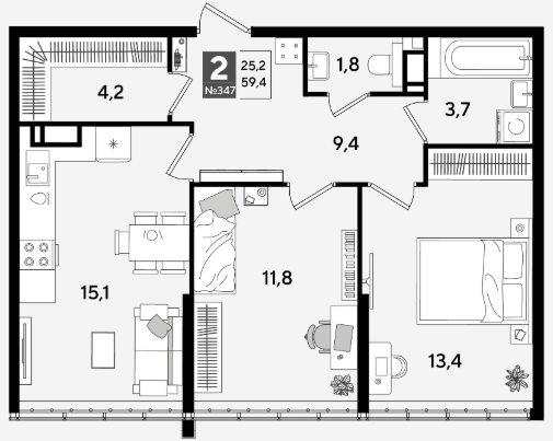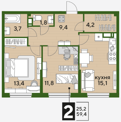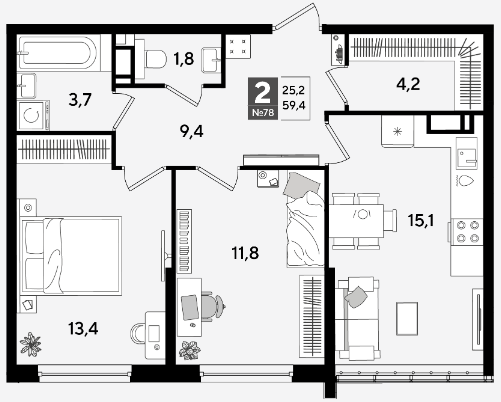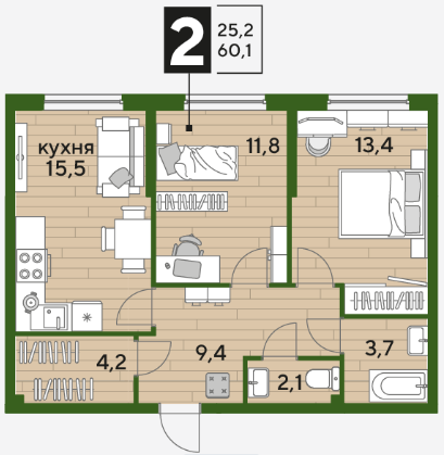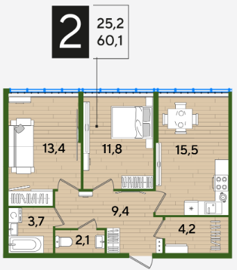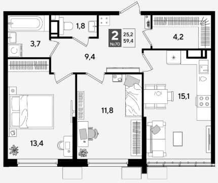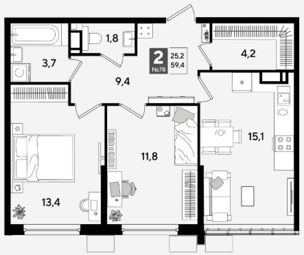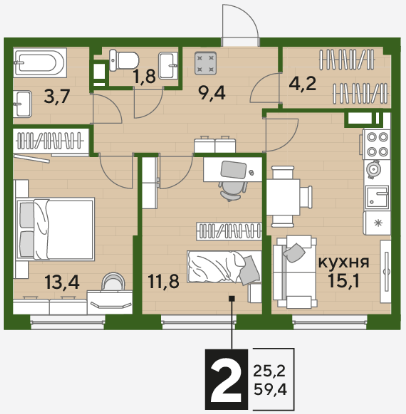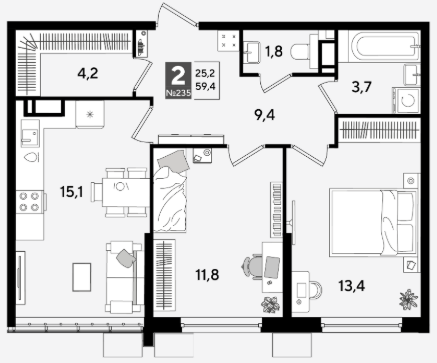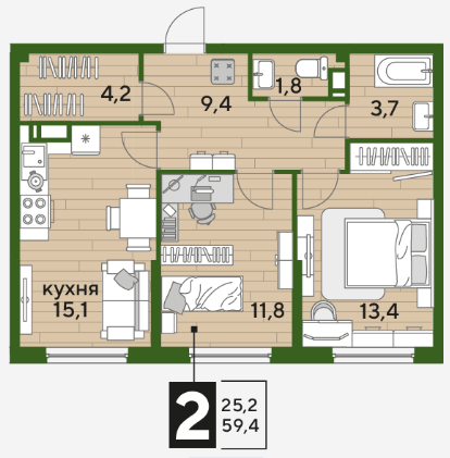 2 | 59.4 / 25.2 м² | от 9 141 660 руб. (153 900 руб./м²) | Планировка | |