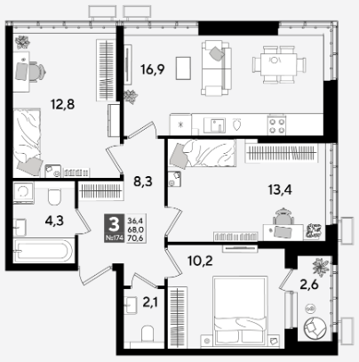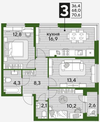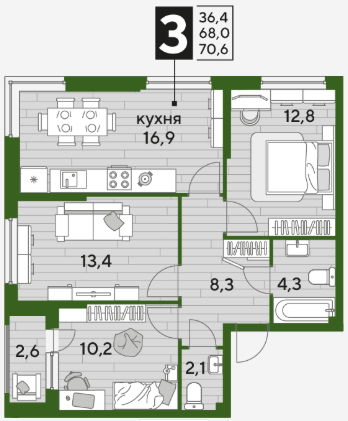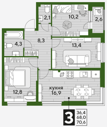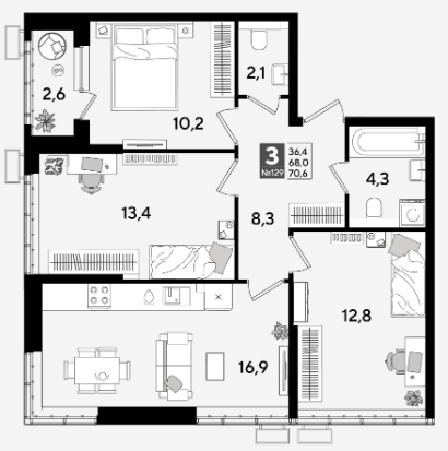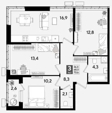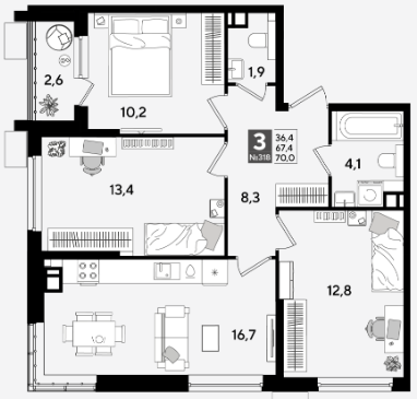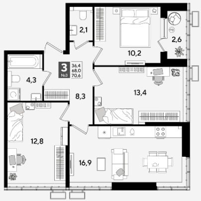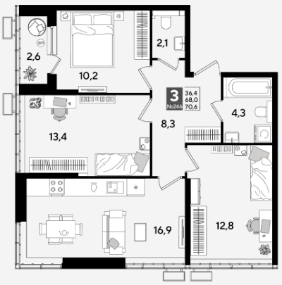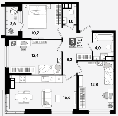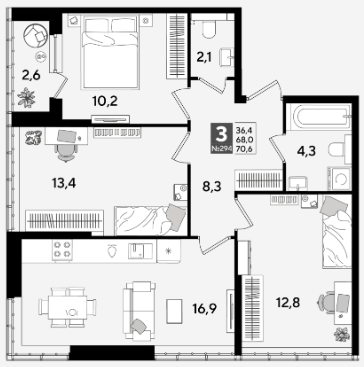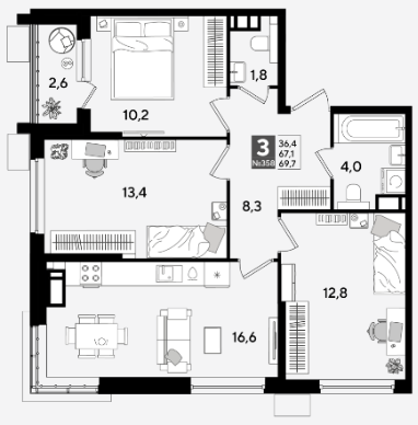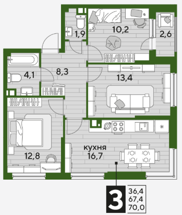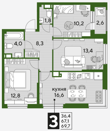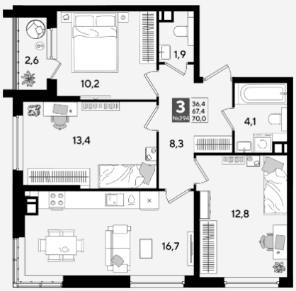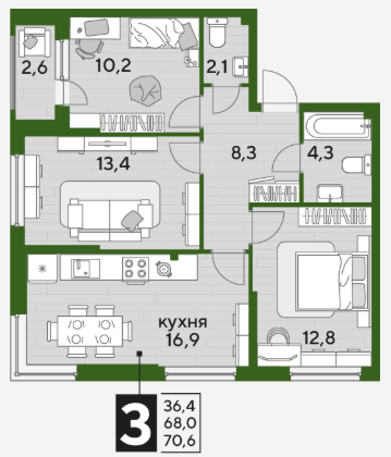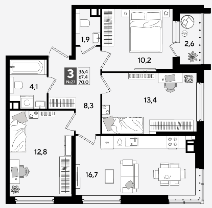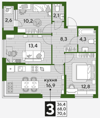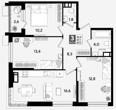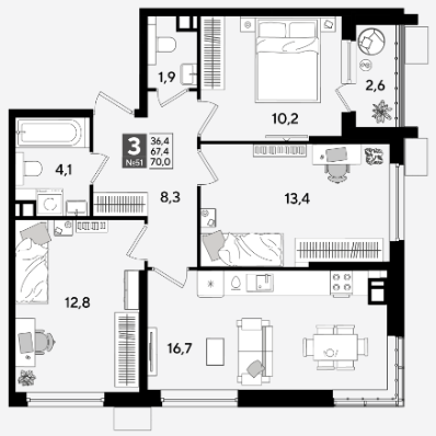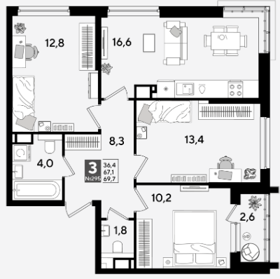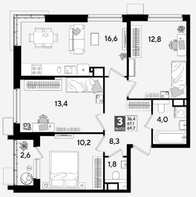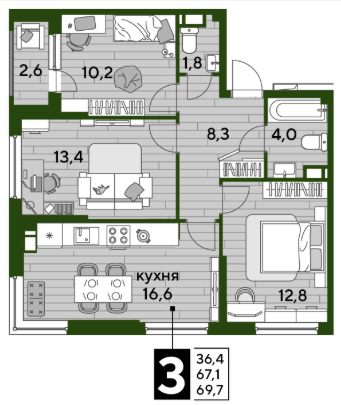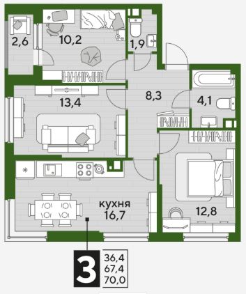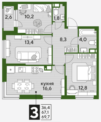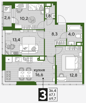 3 | 69.7 / 36.4 м² | от 10 126 800 руб. (145 291 руб./м²) | Планировка | |