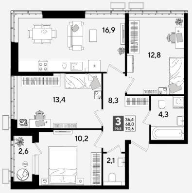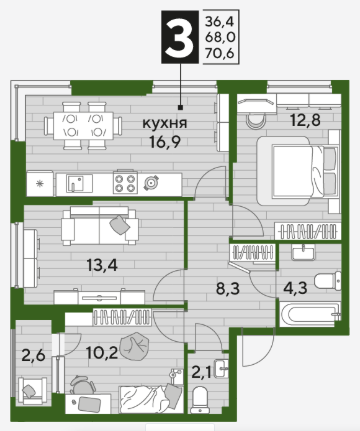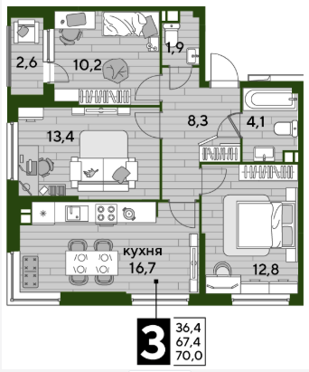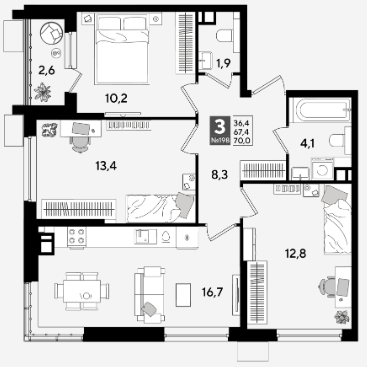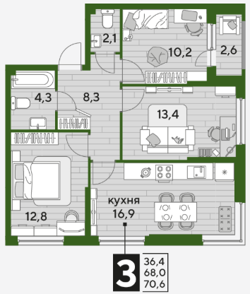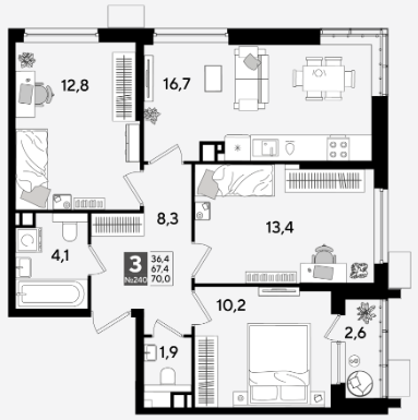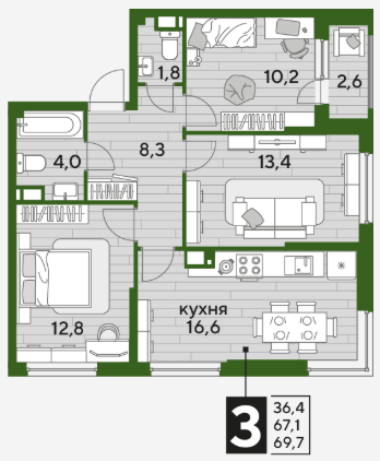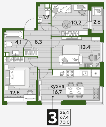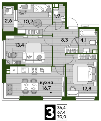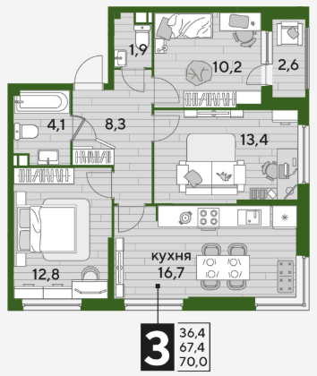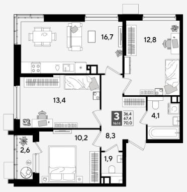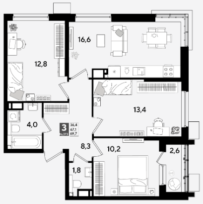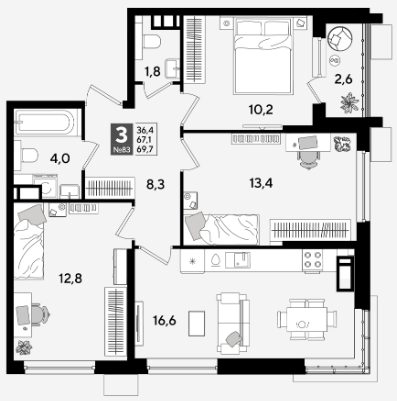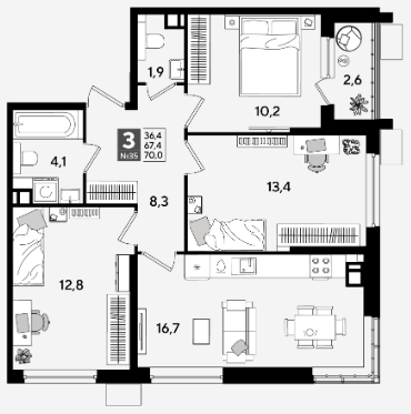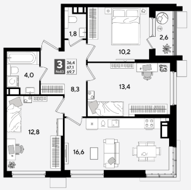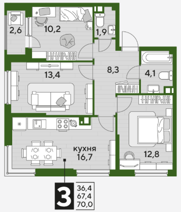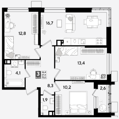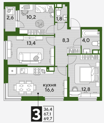 3 | 69.7 / 36.4 м² | от 10 231 960 руб. (146 800 руб./м²) | Планировка |