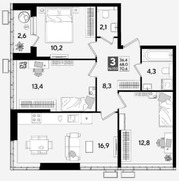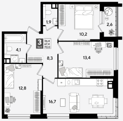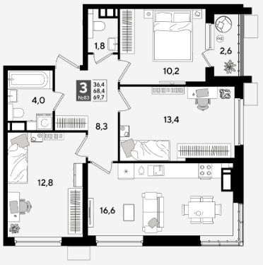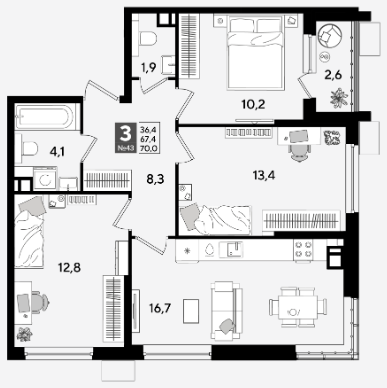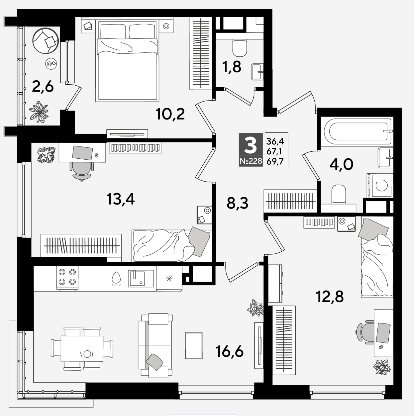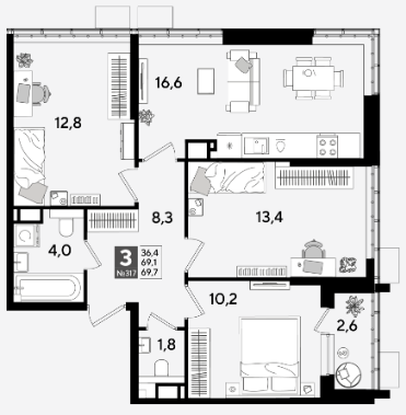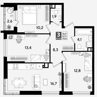 3 | 69.7 / 36.4 м² | от 10 162 260 руб. (145 800 руб./м²) | Планировка |