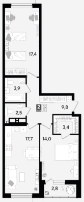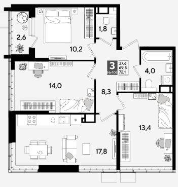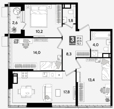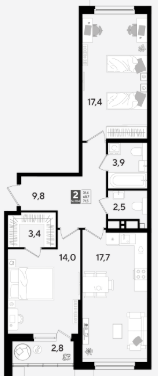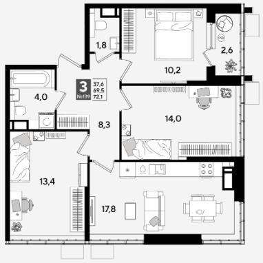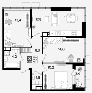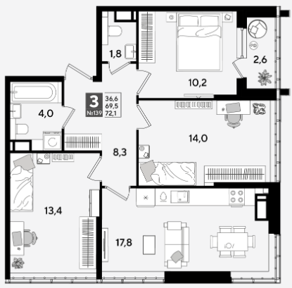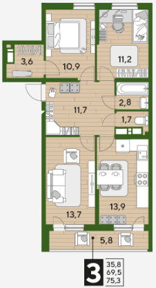 3 | 69.5 / 36.4 м² | от 9 896 800 руб. (142 400 руб./м²) | Планировка |
