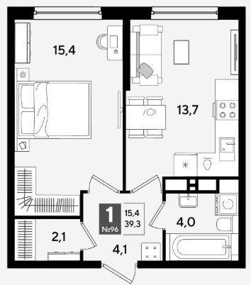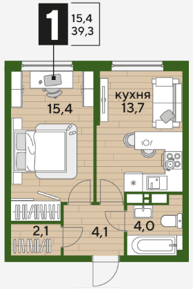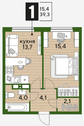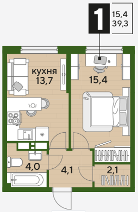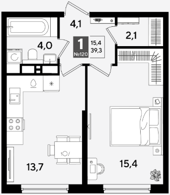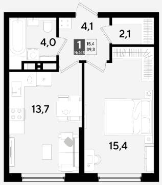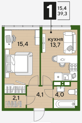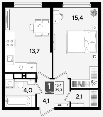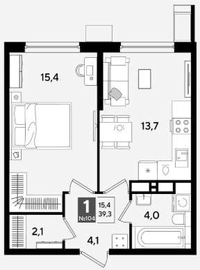 1 | 39.3 / 15.4 м² | от 7 073 999 руб. (180 000 руб./м²) | Планировка | |