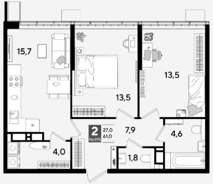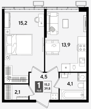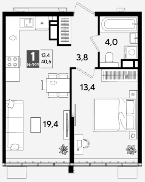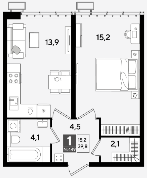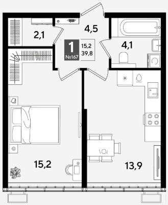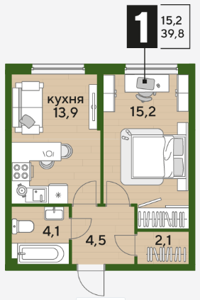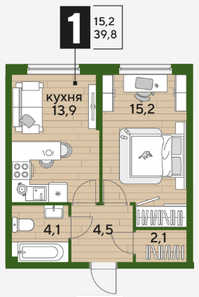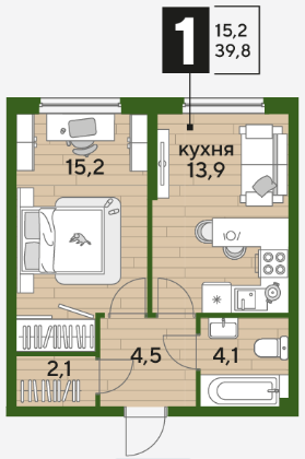 1 | 39.8 / 15.2 м² | от 6 750 079 руб. (169 600 руб./м²) | Планировка | |