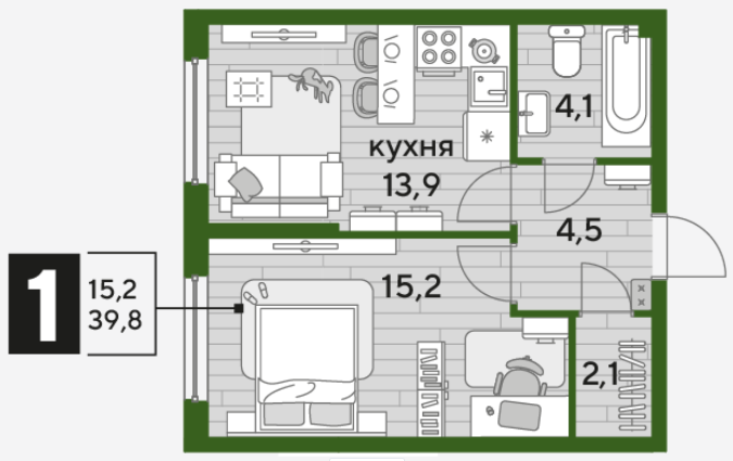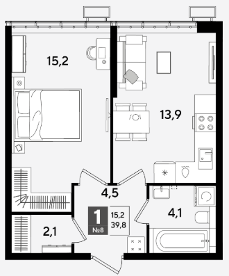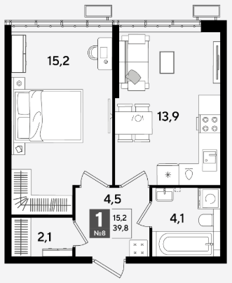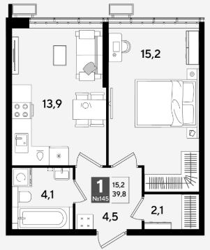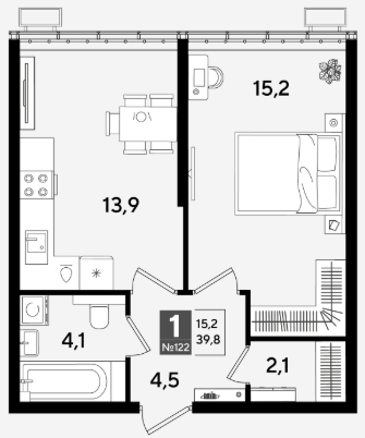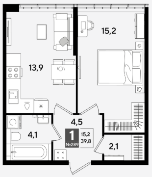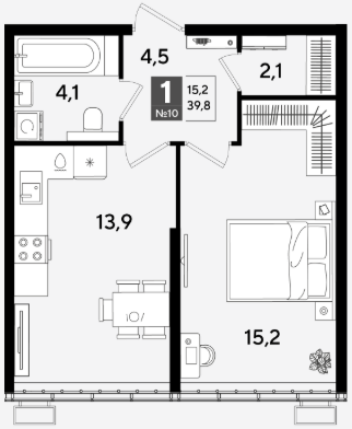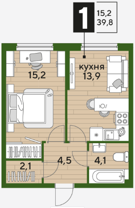 1 | 39.8 / 15.2 м² | от 7 418 719 руб. (186 400 руб./м²) | Планировка | |