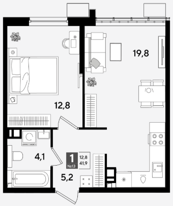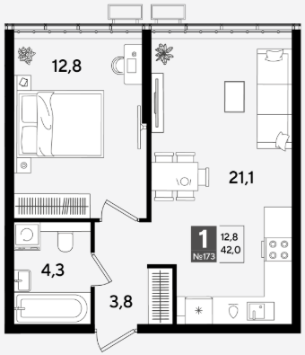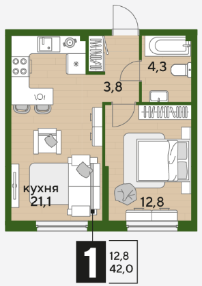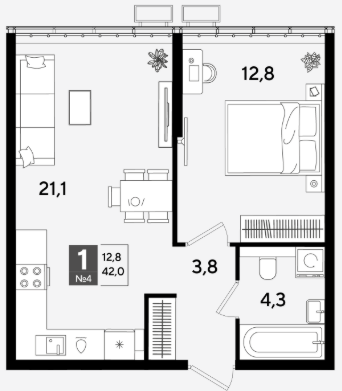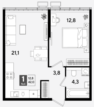 1 | 42.0 / 12.8 м² | от 7 614 600 руб. (181 300 руб./м²) | Планировка | |