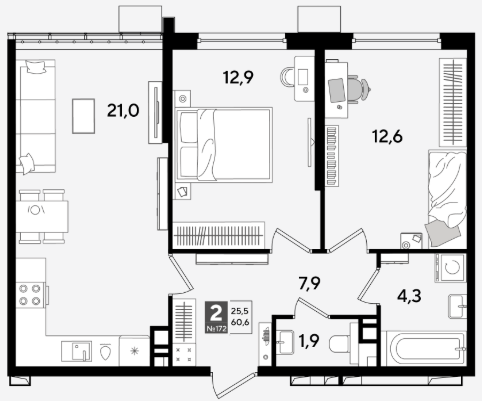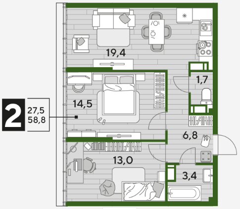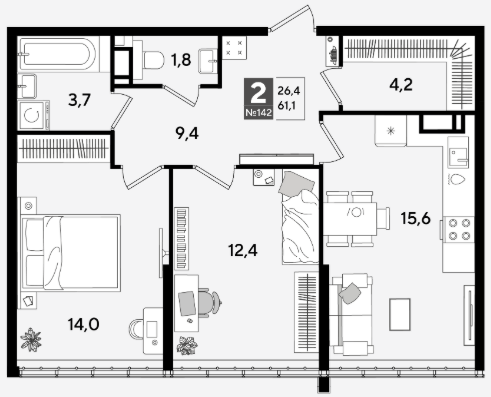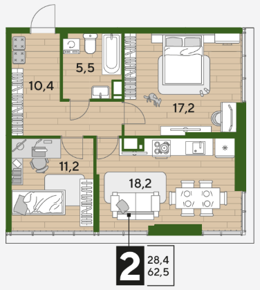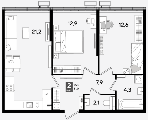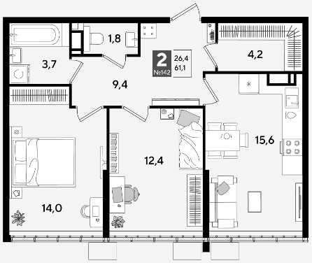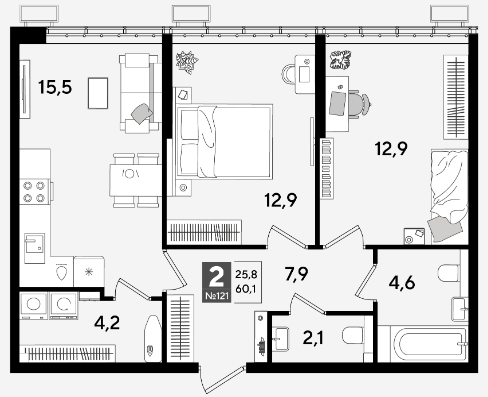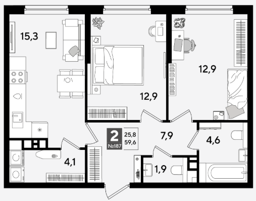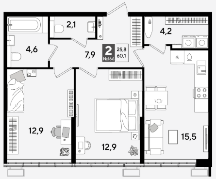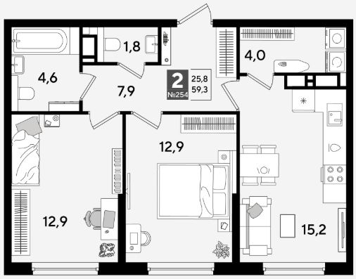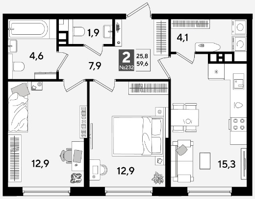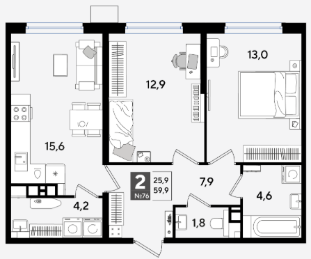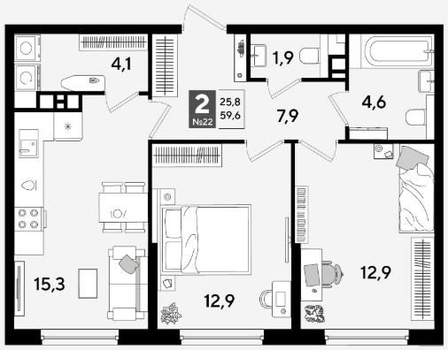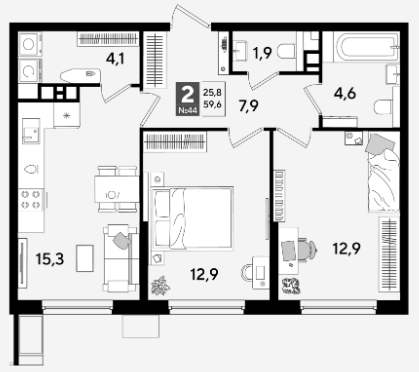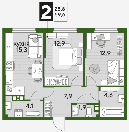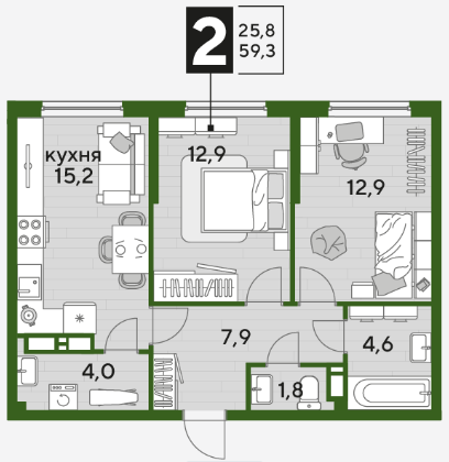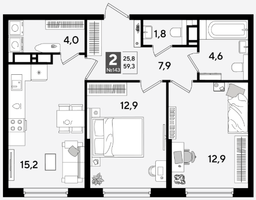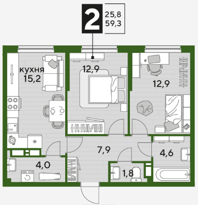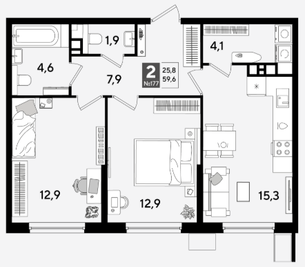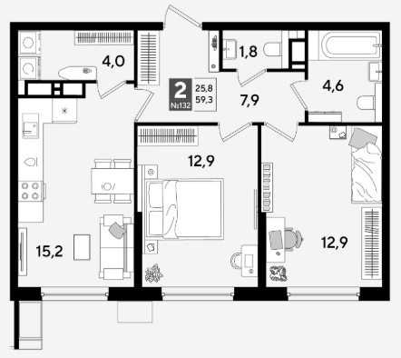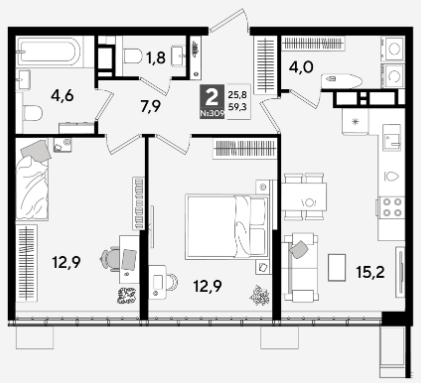 2 | 59.3 / 25.8 м² | от 9 179 640 руб. (154 800 руб./м²) | Планировка | |
