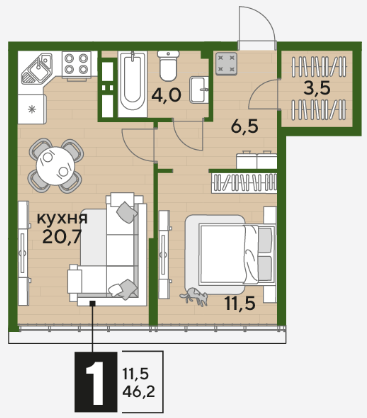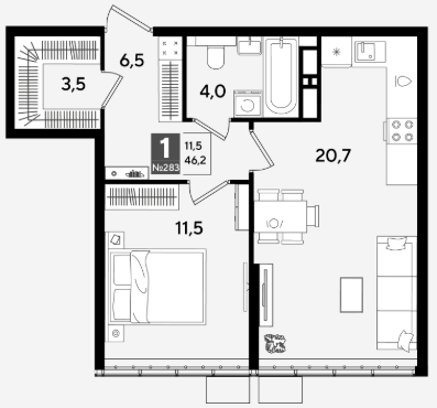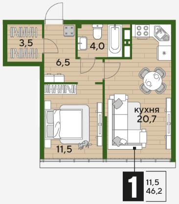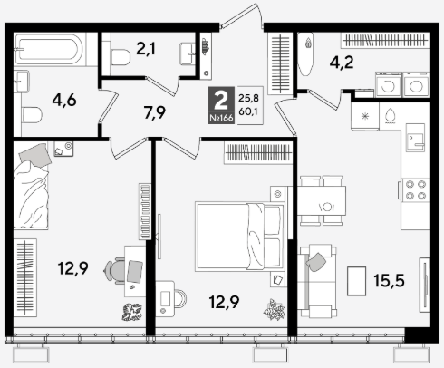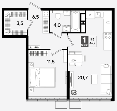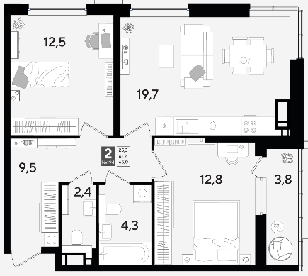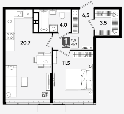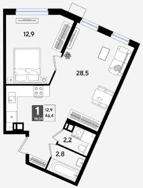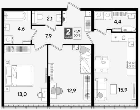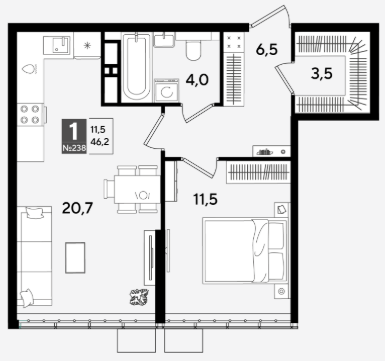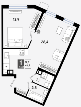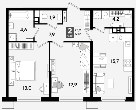 1 | 46.2 / 12.9 м² | от 7 807 800 руб. (169 000 руб./м²) | Планировка | |