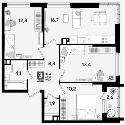 3 | 69.7 / 36.4 м² | от 10 273 780 руб. (147 400 руб./м²) | Планировка |