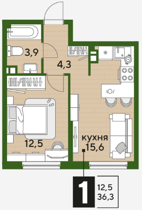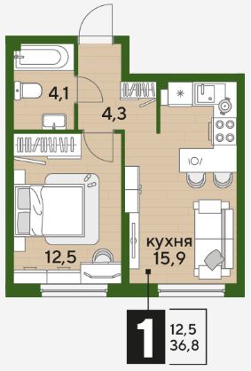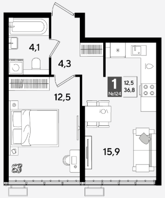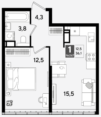 1 | 36.1 / 12.5 м² | от 6 920 370 руб. (191 700 руб./м²) | Планировка | |