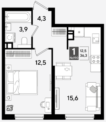 1 | 36.3 / 12.5 м² | от 7 014 230 руб. (193 229 руб./м²) | Планировка | |