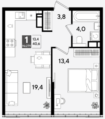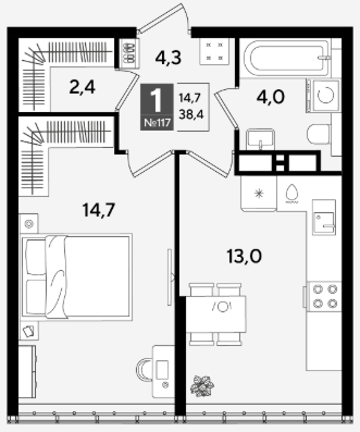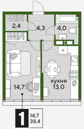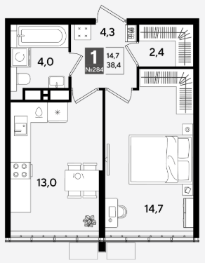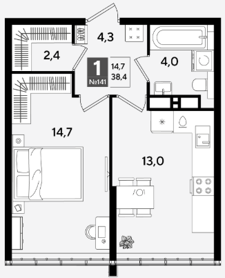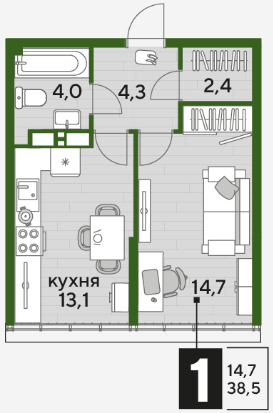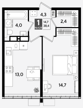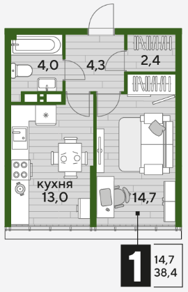1 | 38.4 / 14.7 м² | от 7 415 040 руб. (193 100 руб./м²) | Планировка | |