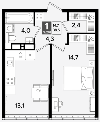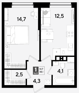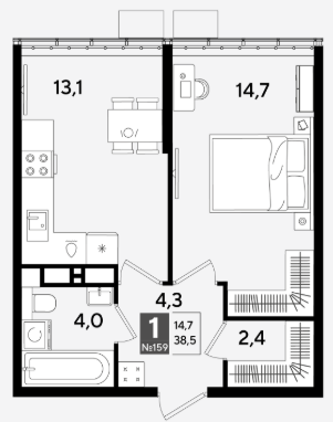 1 | 38.5 / 14.7 м² | от 7 303 450 руб. (189 700 руб./м²) | Планировка | |