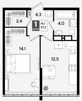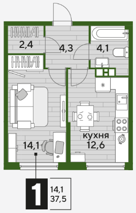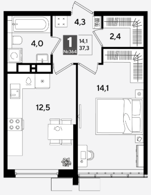 1 | 37.3 / 14.1 м² | от 6 986 289 руб. (187 300 руб./м²) | Планировка | |