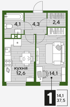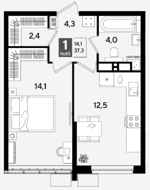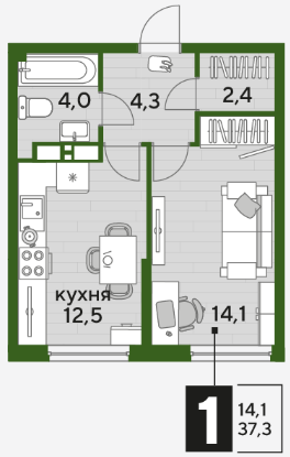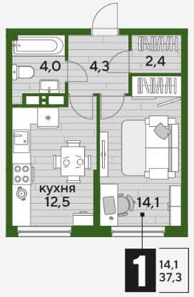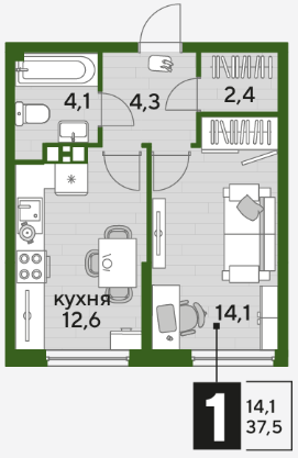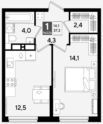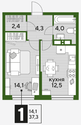 1 | 37.3 / 14.1 м² | от 7 072 079 руб. (189 600 руб./м²) | Планировка | |
