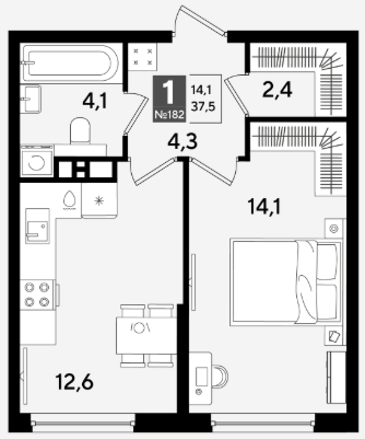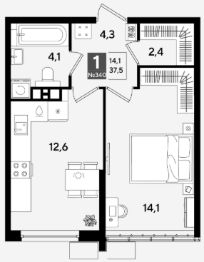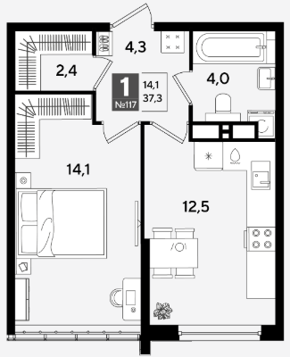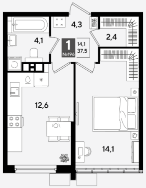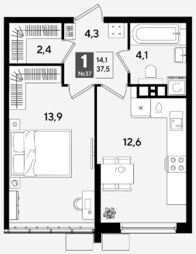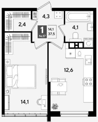 1 | 37.3 / 14.1 м² | от 7 116 839 руб. (190 800 руб./м²) | Планировка | |