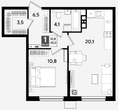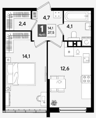 1 | 45.1 / 14.1 м² | от 7 924 070 руб. (175 700 руб./м²) | Планировка | |