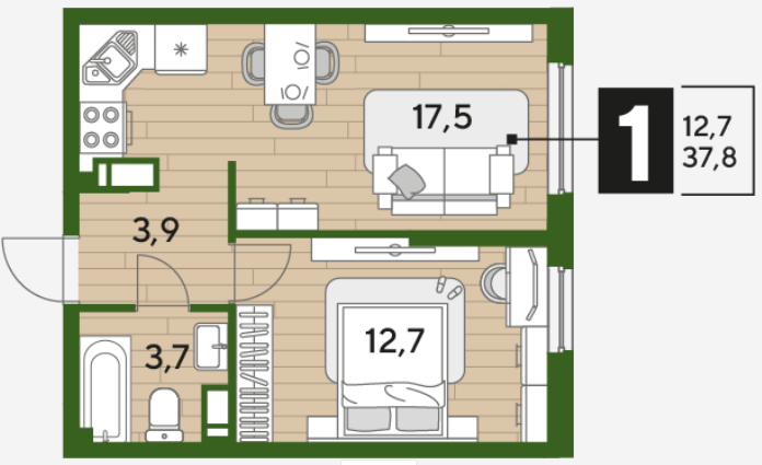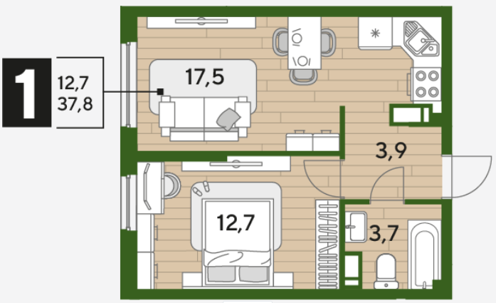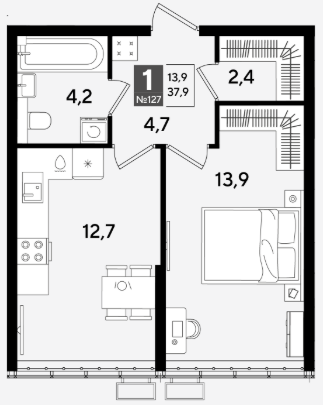 1 | 37.8 / 12.7 м² | от 6 974 099 руб. (184 500 руб./м²) | Планировка | |