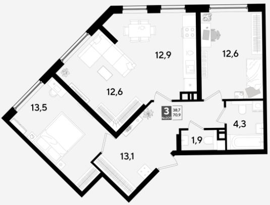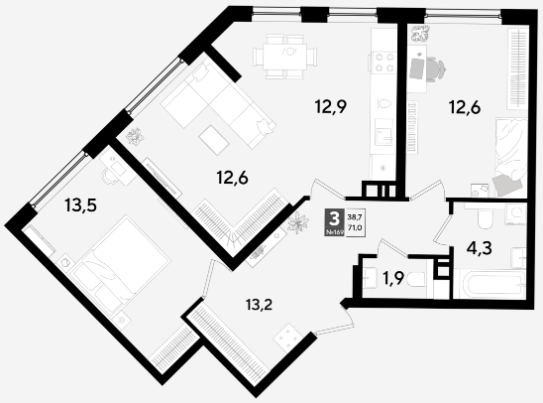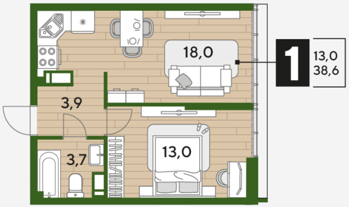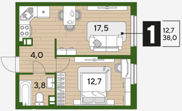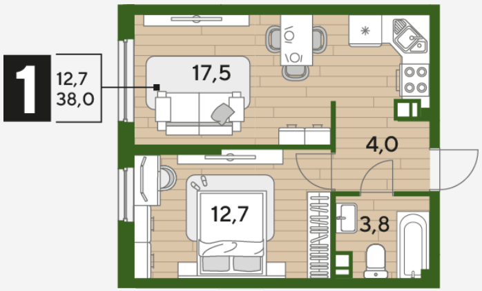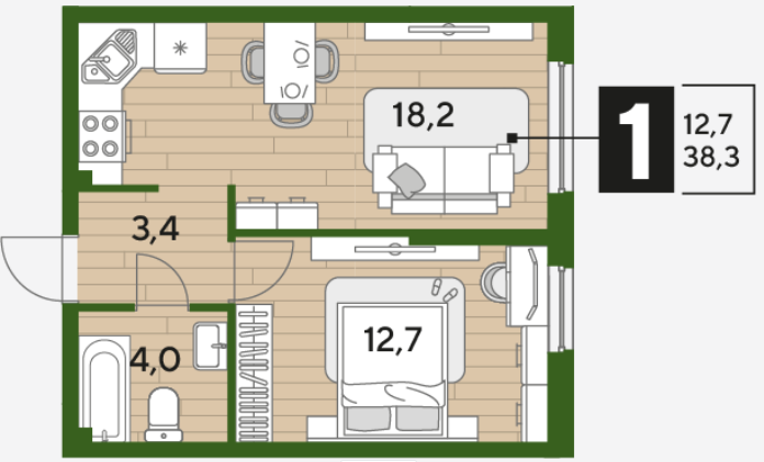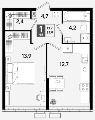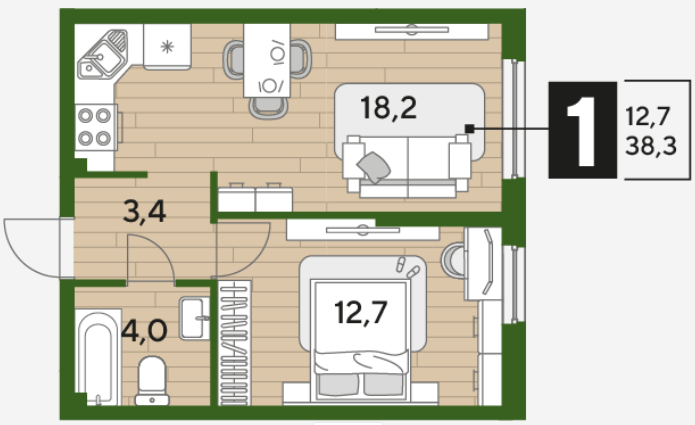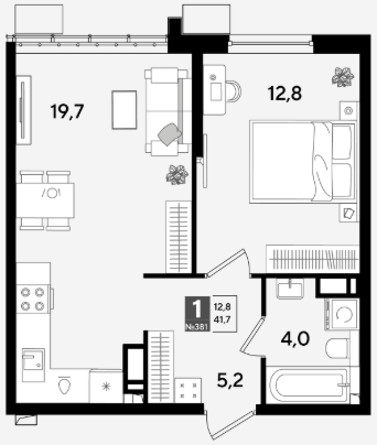 1 | 38.3 / 12.7 м² | от 7 108 479 руб. (185 600 руб./м²) | Планировка | |