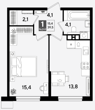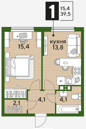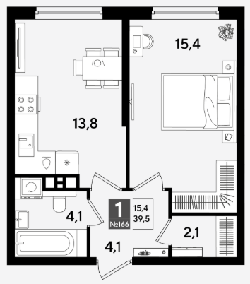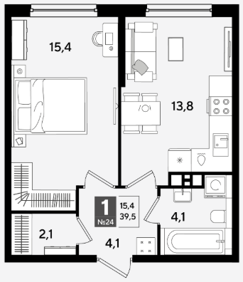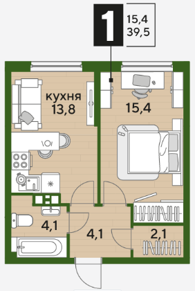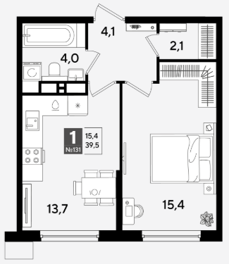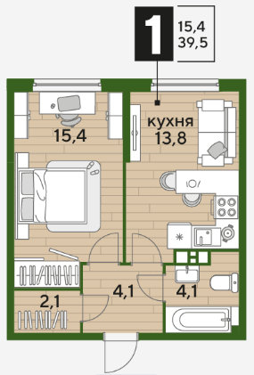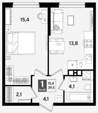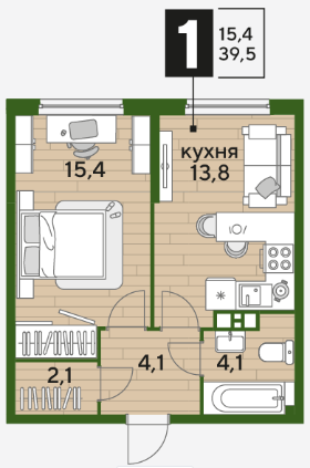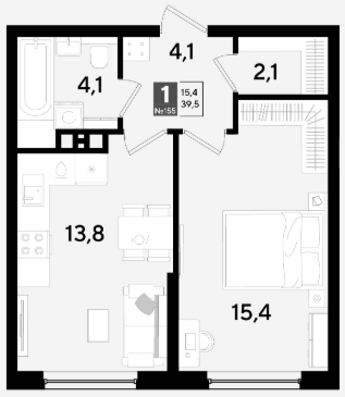 1 | 39.5 / 15.4 м² | от 7 228 500 руб. (183 000 руб./м²) | Планировка | |