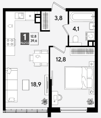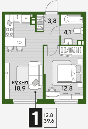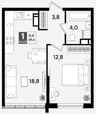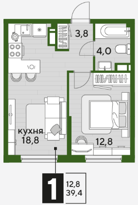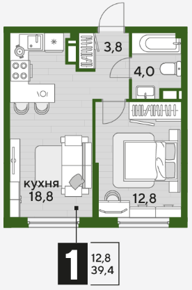 1 | 39.4 / 12.8 м² | от 7 174 740 руб. (182 100 руб./м²) | Планировка | |