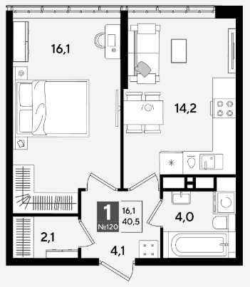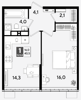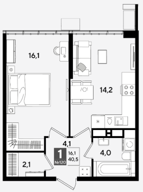 1 | 40.5 / 16.1 м² | от 7 407 450 руб. (182 900 руб./м²) | Планировка | |