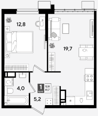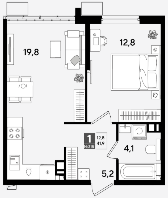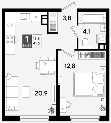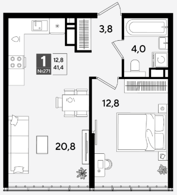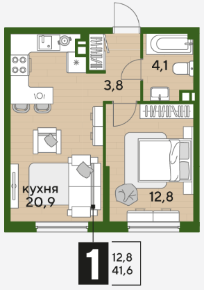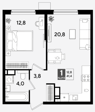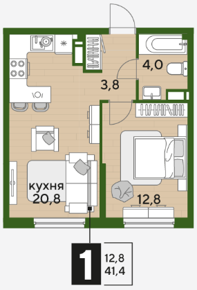 1 | 41.4 / 12.8 м² | от 5 638 680 руб. (136 200 руб./м²) | Планировка | |