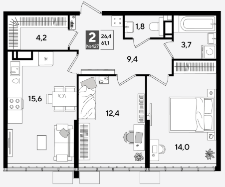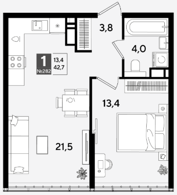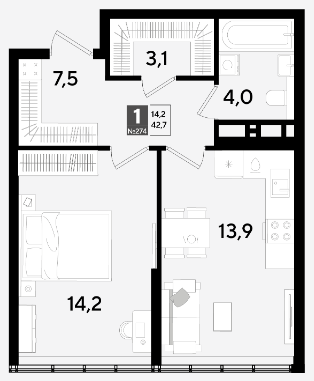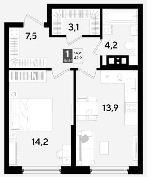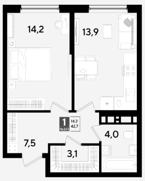 1 | 42.7 / 14.2 м² | от 7 826 910 руб. (183 300 руб./м²) | Планировка | |