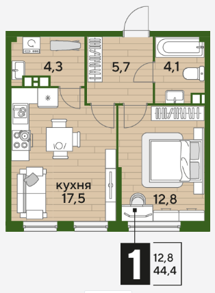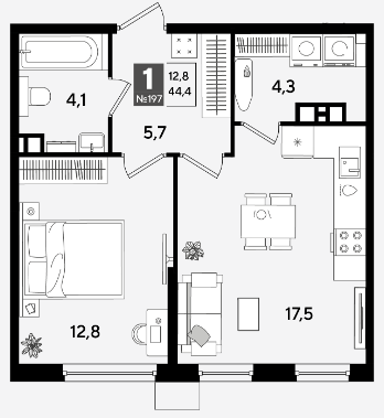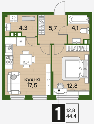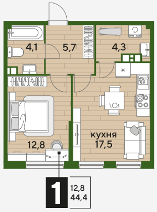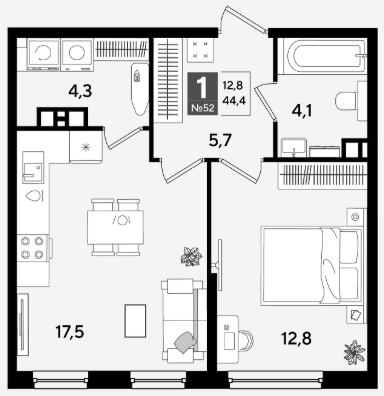 1 | 44.4 / 12.8 м² | от 7 587 960 руб. (170 900 руб./м²) | Планировка | |
