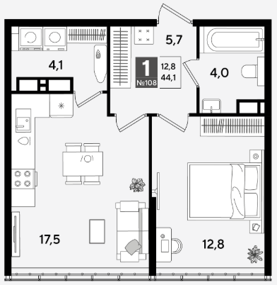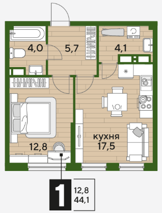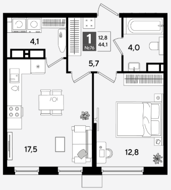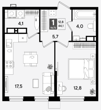 1 | 44.1 / 12.8 м² | от 7 638 120 руб. (173 200 руб./м²) | Планировка | |