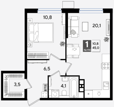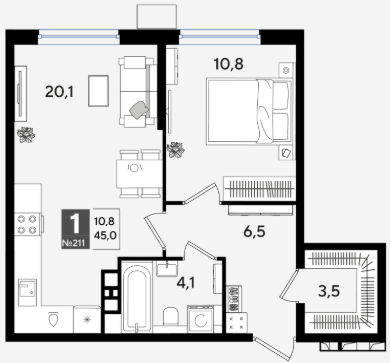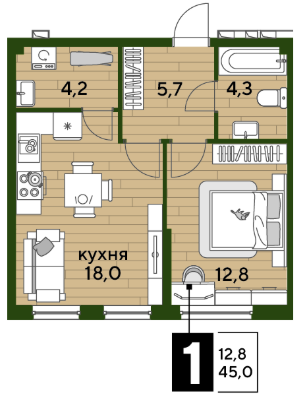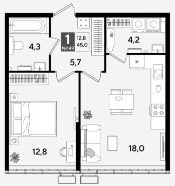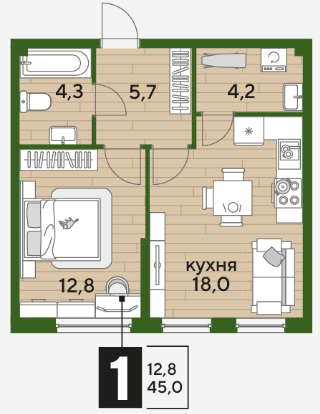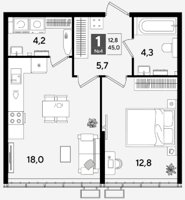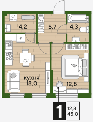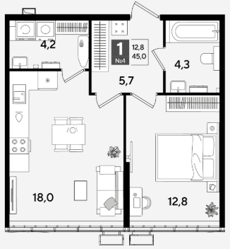 1 | 45.0 / 12.8 м² | от 7 960 500 руб. (176 900 руб./м²) | Планировка | |