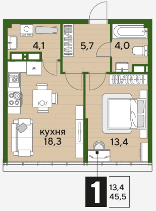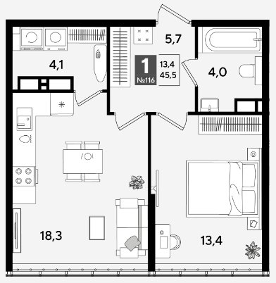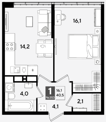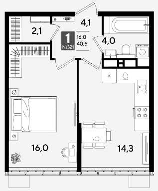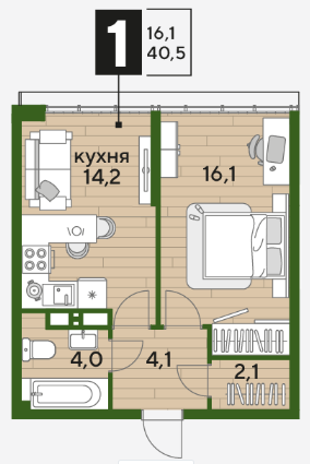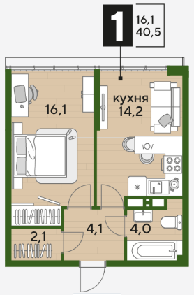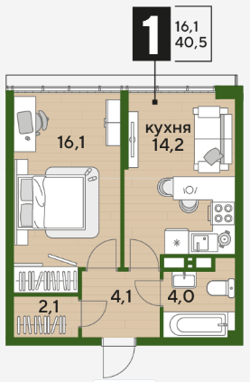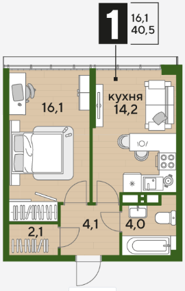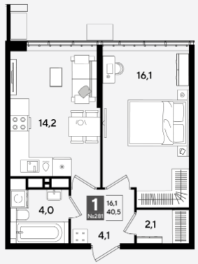 1 | 40.5 / 16.1 м² | от 7 512 750 руб. (185 500 руб./м²) | Планировка | |