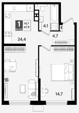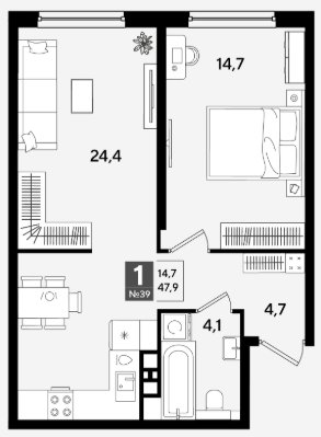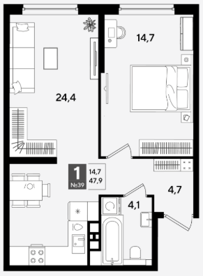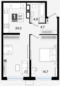 1 | 47.7 / 14.7 м² | от 7 839 090 руб. (164 342 руб./м²) | Планировка | |