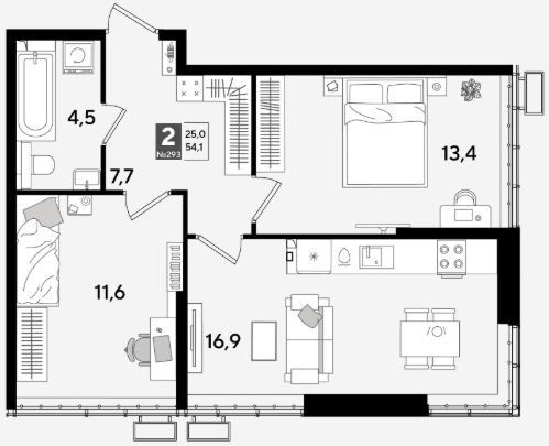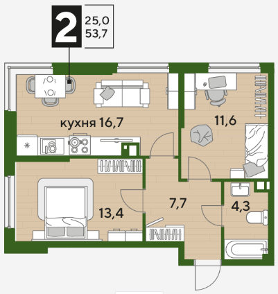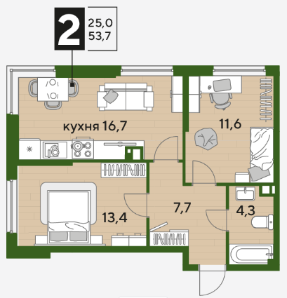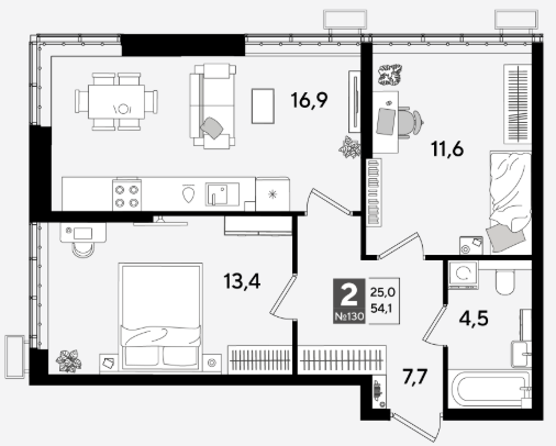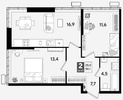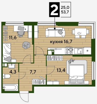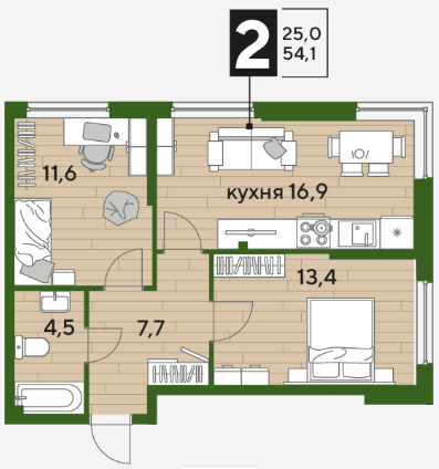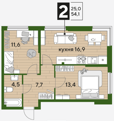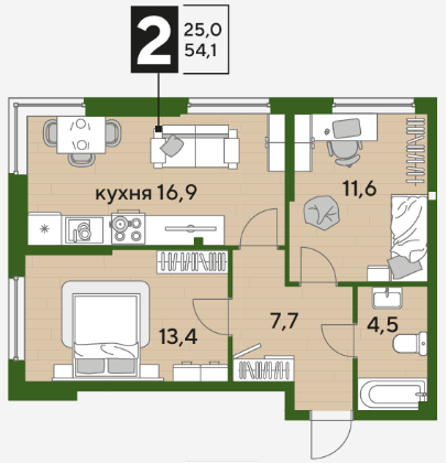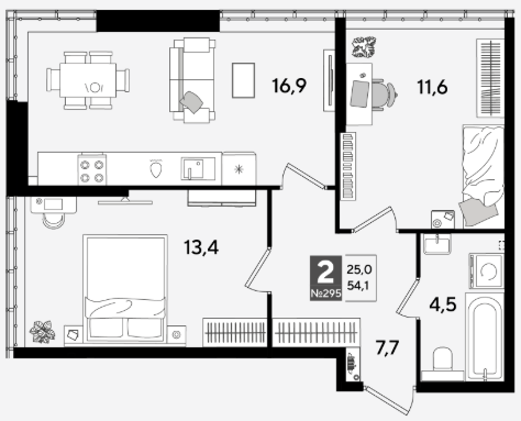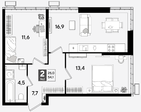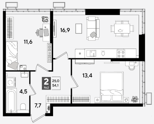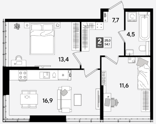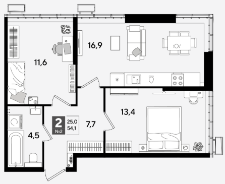 2 | 54.1 / 25.0 м² | от 8 531 570 руб. (157 700 руб./м²) | Планировка |