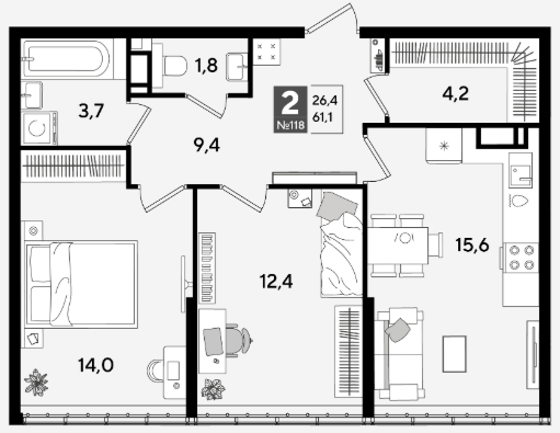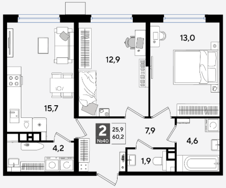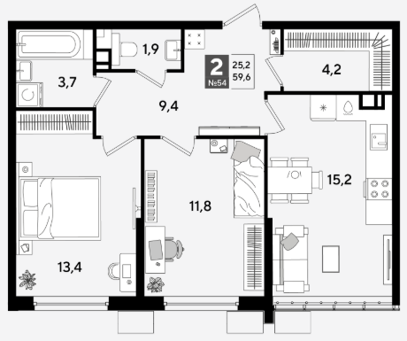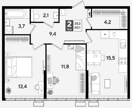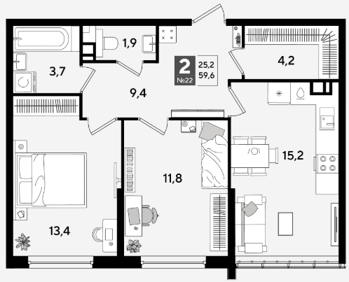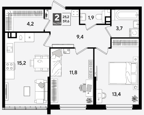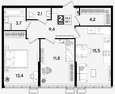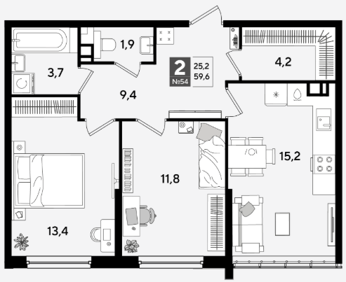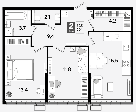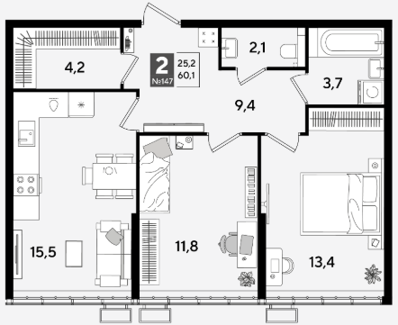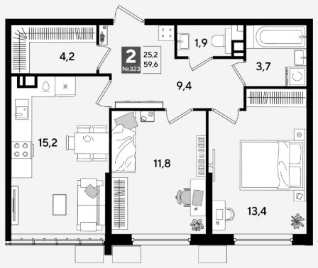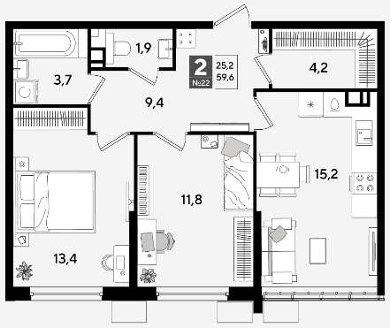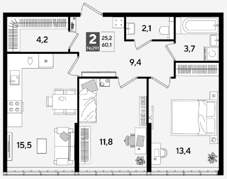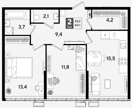 2 | 59.6 / 25.2 м² | от 9 106 020 руб. (152 786 руб./м²) | Планировка | |