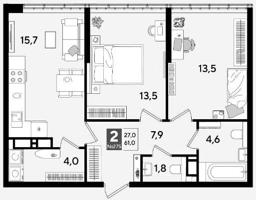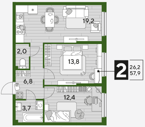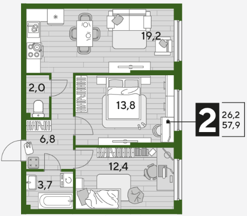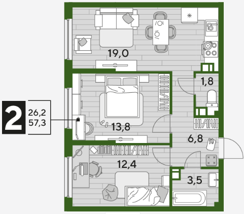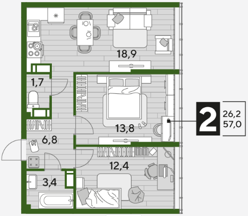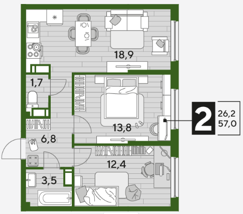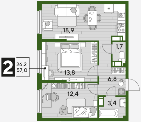 2 | 57.0 / 26.2 м² | от 9 063 000 руб. (159 000 руб./м²) | Планировка |