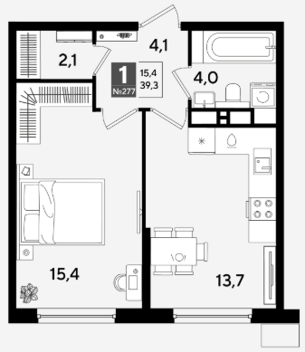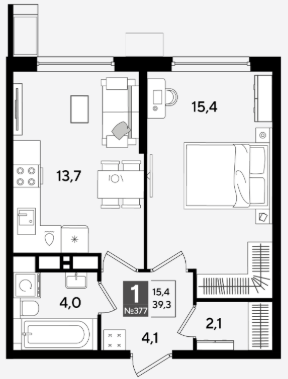 1 | 39.3 / 15.4 м² | от 7 085 789 руб. (180 300 руб./м²) | Планировка | |
