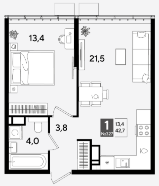 1 | 42.7 / 12.4 м² | от 7 997 710 руб. (187 300 руб./м²) | Планировка | |