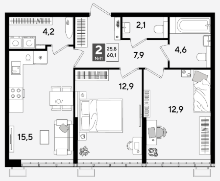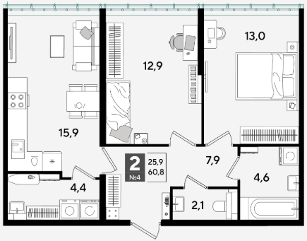 2 | 59.9 / 25.9 м² | от 9 272 520 руб. (154 800 руб./м²) | Планировка | |