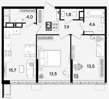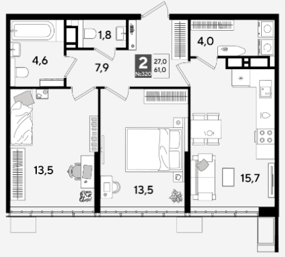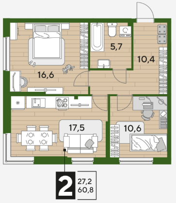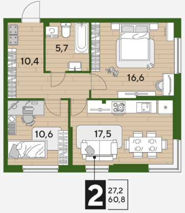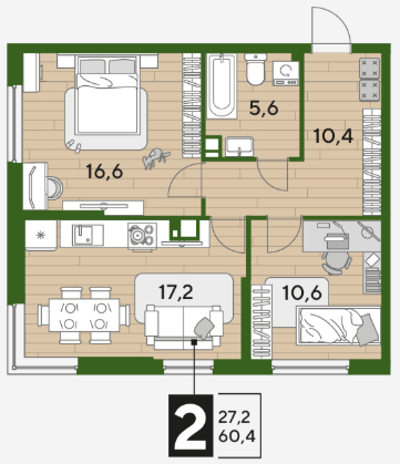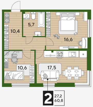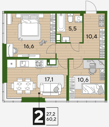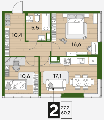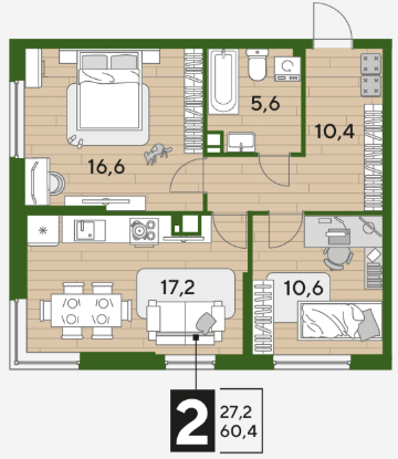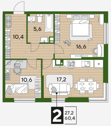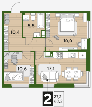 2 | 60.1 / 27.2 м² | от 9 231 360 руб. (153 600 руб./м²) | Планировка | |