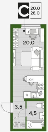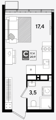 студия | 20.9 / 17.4 м² | от 4 679 510 руб. (223 900 руб./м²) | Планировка | |