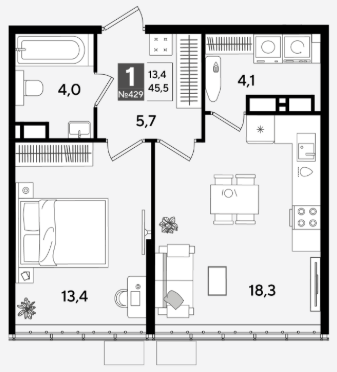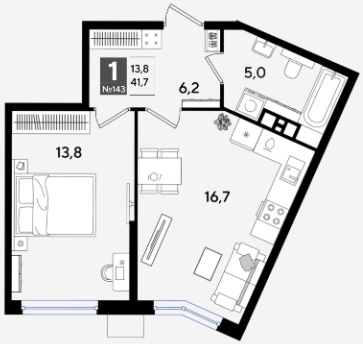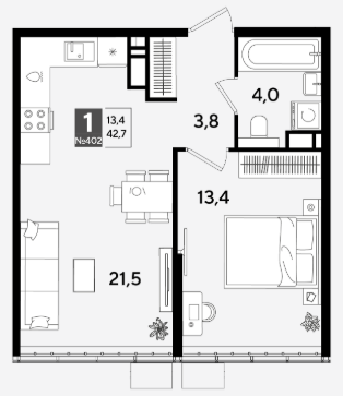 1 | 41.7 / 13.8 м² | от 7 468 470 руб. (179 100 руб./м²) | Планировка | |