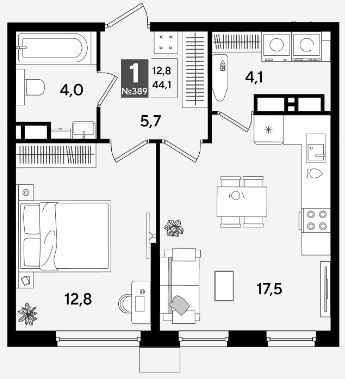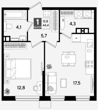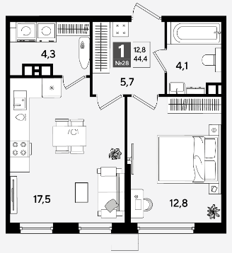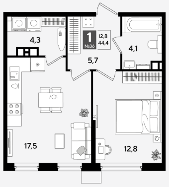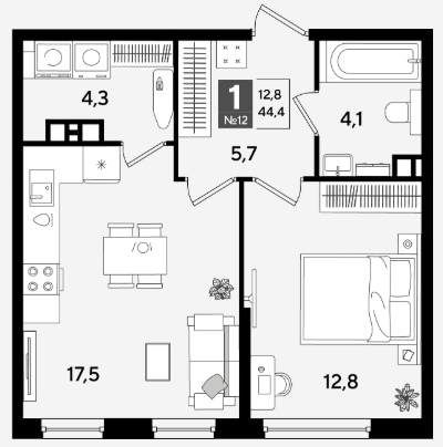 1 | 44.4 / 12.8 м² | от 7 894 320 руб. (177 800 руб./м²) | Планировка | |